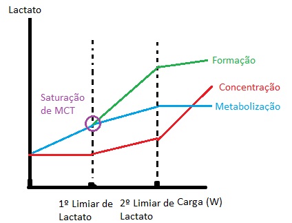 Analisando-se o comportamento da curva de lactato ao longo de exercícios de cargas progressivas, observa-se que até o primeiro limiar de lactato, não há aumento da concentração de lactato no sangue, já que a maior produção é compensada pela maior metabolização; atingida uma determinada carga (variável para cada indivíduo) a concentração de lactato começa a aumentar, porque a produção e a metabolização sofrem uma pequena quebra, onde a produção passa a ser maior (ocorre uma saturação de MCT: carreador do piruvato para dentro da mitocôndria, aumentando a concentração de piruvato no citoplasma, como já visto anteriormente); consequentemente a concentração plasmática aumenta; para um valor mais elevado de carga, a concentração de lactato dispara, já que a produção continua aumentando e a metabolização atinge seu limite.