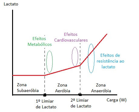 A partir do gráfico acima, pode-se definir zonas de cargas para treinamento: abaixo do primeiro limiar chama-se de zona subaeróbia; entre o primeiro e o segundo limiar fica a zona aeróbia; a partir do segundo limiar está a zona anaeróbia. Esta divisão implica na determinação da especificidade e adequação do treinamento. A zona aeróbia extensiva (em verde) gera efeitos de treinamento metabólicos, com cargas mais leves e de longa durantação (aumento da capilarização tecidual, número de mitocôndrias, concentração de glicogênio). A zona anaeróbia intensiva (em roxo) gera efeitos cardiovasculates, de intensidade mais alta e cargas mais intensas (redução de freqüência cardíaca, aumento do volume sistólico, melhora da contratilidade do coração). Ao retornar-se ao treinamento após um período de afastamento, a intensidade é restringida pela incapacidade metabólica, de modo que o indivíduo entra em fadiga mais cedo por razões metabólicas (carência da concentração ideal de mitocôndrias, acúmulo de lactato, entre outros). O primeiro objetivo do treinamento é gerar efeitos metabólicos, adaptando o indivíduo para as intensidades seguintes, incrementando-se a capacidade cardiovascular. A medida em que o tempo de treinamento passa, deslocam-se os valores de carga entre as zonas (desloca-se a curva para a direita), ou seja, uma carga que antes pertencia à zona anaeróbia pode passar a pertencer à zona aeróbia, de modo que o indivíduo pode treinar numa carga mais alta; os valores de carga máxima também aumentam. A zona subaeróbia não gera efeito de treinamento (recreação).