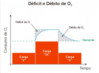 Este comportamento do sistema traz um problema, pois em um momento a necessidade de consumo é maior que o fornecimento de O2, culminando em um déficit de oxigênio. O consumo de oxigênio é relacionado a participação das vias aeróbias de resíntese de ATP: maior ativação da via aeróbia, maior consumo de O2. Como a contribuição do sistema aeróbio está limitada, o sistema é assumido pela via anaeróbia para fornecer energia. Neste momento pode haver o acúmulo de lactato, aumentando o salto da carga rapidamente e tendendo a estabilização e à queda, quando atingido o steady state (estado de equilíbrio).
