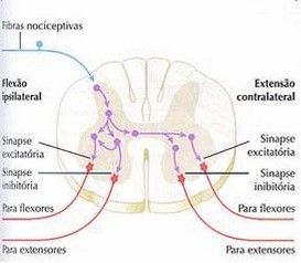 O reflexo flexor de retirada, é mediado por um arco-reflexo polissináptico, no qual estímulos nociceptivos e termoceptivos são impulsionados por neurônios aferentes e mediados por neurônios de associação que estimulam neurônios de um ou mais segmentos medulares para executar a flexão do membro estimulado. Paralelamente, os mesmos neurônios aferentes emitem colaterais que cruzam a linha média da medula e excitam os motoneurônios alfa. Estes se dirigem aos músculos extensores do membro contralateral. Um exemplo é quanto pisamos em um prego, ou colocamos uma mão em uma chapa quente.