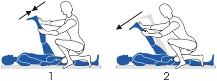 1. Paciente em decúbito dorsal e com quadril flexionado até sua amplitude máxima. O profissional pede a contração e resiste ao movimento.