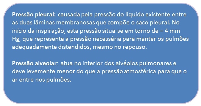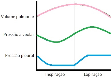 A diferença entre a pressão das pleura é chamada pressão transpulmonar, variável diretamente afetada pelas forças elásticas que atuam sobre os pulmões. Para qualquer grau de expansão pulmonar, a pressão transpulmonar tende a levar o pulmão ao colapso. À medida em que a inspiração transcorre, o volume torácico e pulmonar aumentam, a pressão pleural torna-se mais negativa, causando a queda da pressão alveolar e a migração do ar para dentro dos pulmões levando à expansão da caixa torácica e a redução da pressão pleural. O valor da pressão pleural, antes em – 4 mm Hg, migra para – 8 ou – 10 mm Hg, e a relação de proximidade anatômica entre pleura e pulmão gera a transferência imediata da queda de pressão para o ambiente alveolar, de modo que a pressão alveolar também cai, provocando um desequilíbrio pressórico entre o compartimento intrapulmonar e o atmosférico de forma que o ar do meio externo penetre nos pulmões. À medida em que o ar entra, tanto o volume pulmonar quanto a pressão alveolar aumentam, e o próprio aumento de pressão encerra o influxo de ar. No momento em que a pressão alveolar se iguala ao seu valor inicial, o movimento expiratório começa. O relaxamento da musculatura inspiratória, associado à retração elástica dos tecidos pulmonares e torácicos, gera a diminuição do volume e o subseqüente aumento da pressão pleural, imediatamente transmitida para os alvéolos, causando elevação da pressão alveolar, que supera a atmosférica. Quando o ar migra para o meio externo, o volume e a própria pressão alveolar começam a declinar. Quando restabelecido o valor inicial da pressão, encerra-se o movimento expiratório e reinicia-se o inspiratório.