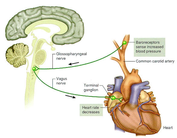 Os baroceptores são terminações nervosas do tipo “buquê”, situadas nas paredes das artérias (principalmente torácicas e cervicais), onde são estimulados por estiramento. Os mais importantes conjuntos de baroceptores localizam-se junto ao seio carotídeo e ao arco aórtico. Diante da estimulação adequada, os terminais carotídeos emitem, via nervo de Hering e glossofaríngeo, os potenciais de ação para o feixe solitário bulbar, enquanto os terminais aórticos transmitem seus impulsos nervosos através dos nervos vagos para a mesma área central. Uma vez tendo os potenciais de ação atingido o trato solitário, sinais secundários são emitidos, inibindo ou excitando o centro vasomotor e o centro vagal.