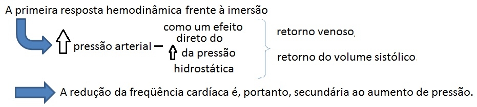 A simples disposição dos pés em uma bacia de água causa a diminuição da freqüência cardíaca na ordem de 2 a 3 batimentos. Quanto maior o volume de corpo submerso, maior a bradicardia decorrente. Isto ocorre porque a água, em contato direto com as áreas periféricas, gera a compressão da vasculatura da região mergulhada, causando um aumento de pressão. O aumento da pressão arterial, devido à ação da pressão hidrostática sobre o organismo, sensibiliza os baroceptores, que induzem o reflexo baroceptor, gerando bradicardia. A magnitude desta bradicardia é extremamente variável entre os indivíduos, situando-se numa faixa que compreende desde 5 até 30 batimentos a menos em função da imersão. A temperatura da água também afeta a redução do número de batimentos, uma vez que altera os valores de pressão. Quanto maior a temperatura da piscina, maior a tendência à vasodilatação e à queda de pressão. Neste caso, a bradicardia não é tão evidente, ao contrário do que ocorre quando a piscina está fria.